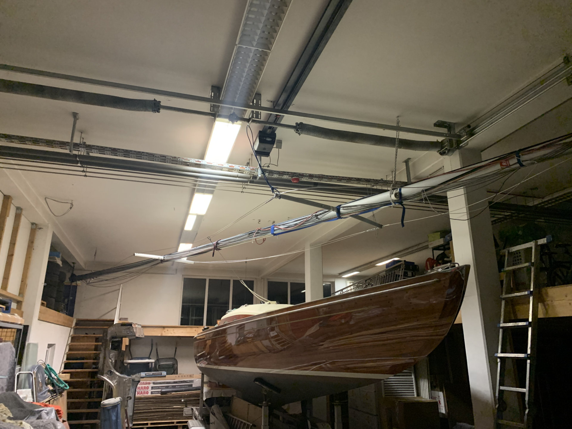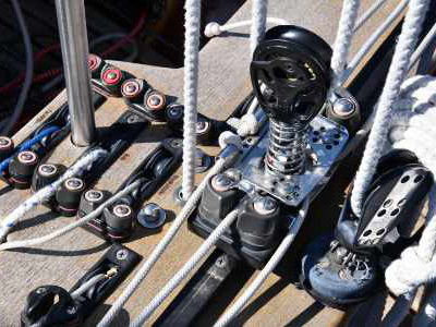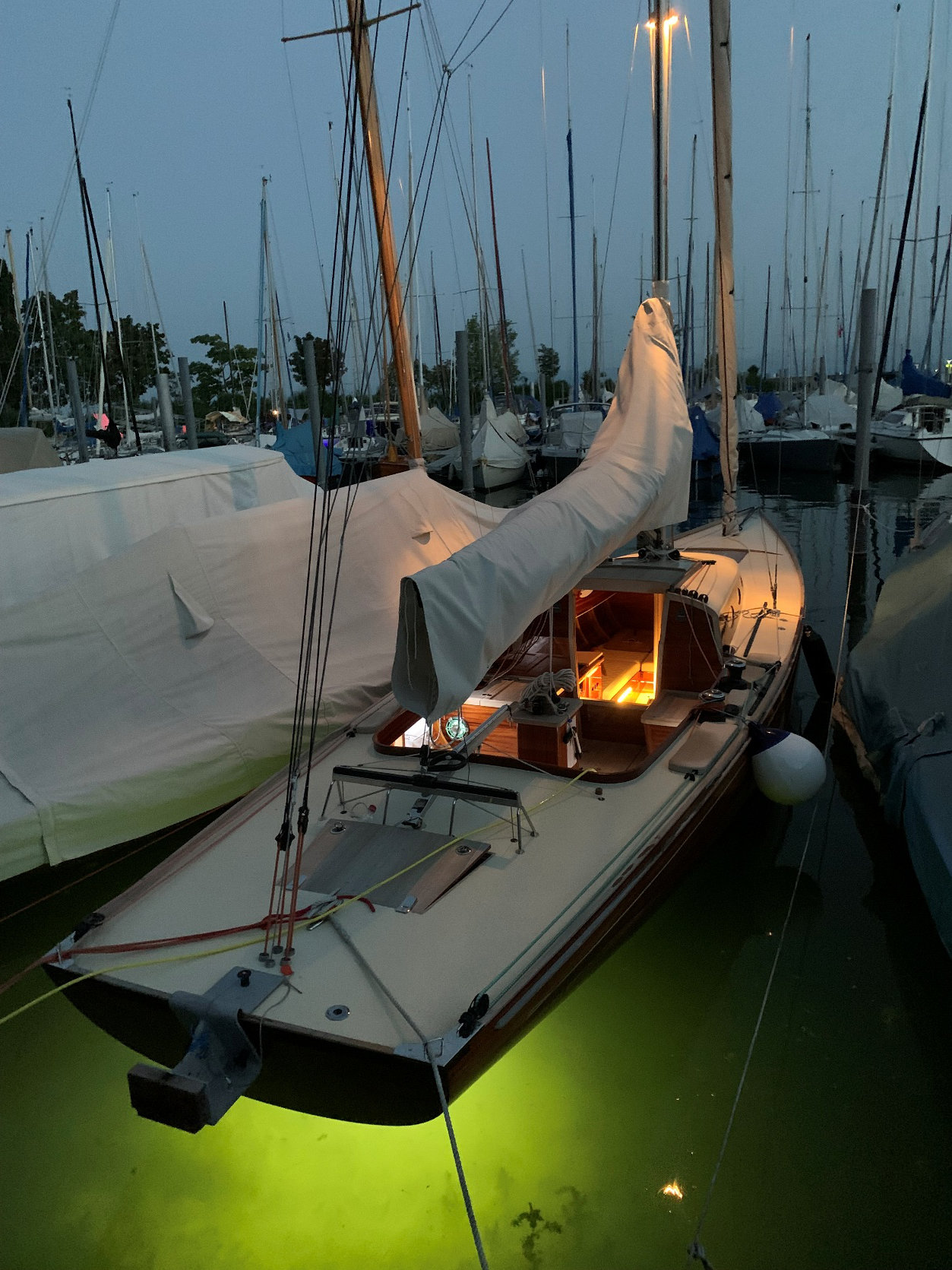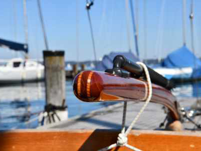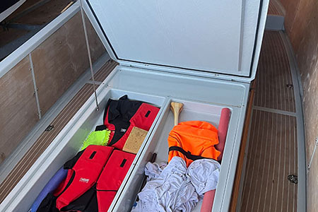 Zubehör: Spinnakerbaum, Bootshaken, 2 Holzpaddel, 3 Fender, 1 Großsegel, 1 Genua, 1 Sturmfock, 1 Spinnaker, Belegleinen, Anker mit Leine, 1 Eimer mit 2 Schöpfkellen, Schublade mit etwas Werkzeug, Torqeedo Außenbordmotor mit Batterie
