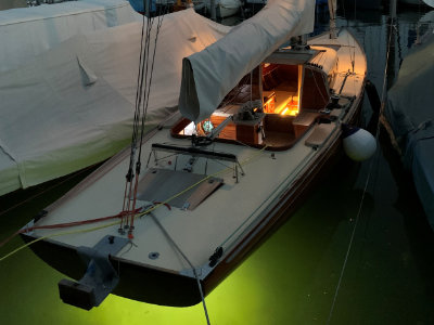 Rumpf/Deck: Mahagoni geplankt/ Sandwichplatte überlaminiert mit hellgelbem Raubelag (wie auf Ölbild im BYC) / Unterwasserschiff mit 2 Lagen GFK abgedichtet; Bleikiel restauriert