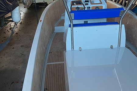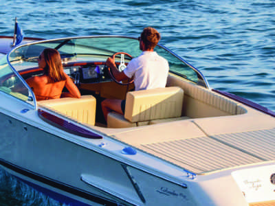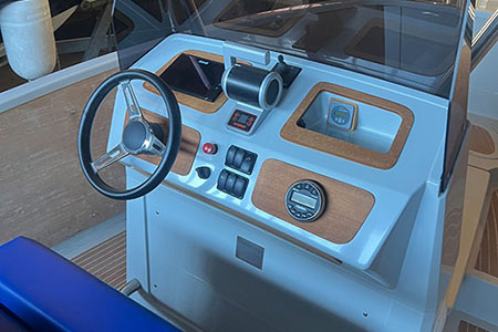 Zubehör: Bugstrahlruder, Kühlschublade, Polster für zwei Sonnendecks und Führerstand im Königsblau, 12V Batterie für Verbraucher, Soundsystem mit 4 Boxen, Navigationsbeleuchtung, Innenbeleuchtung, Ganzpersenning, Badeleiter