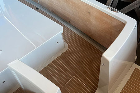 Rumpf/Deck: GFK Rumpf weiß / Teakstabdeck auf Sperrholz
